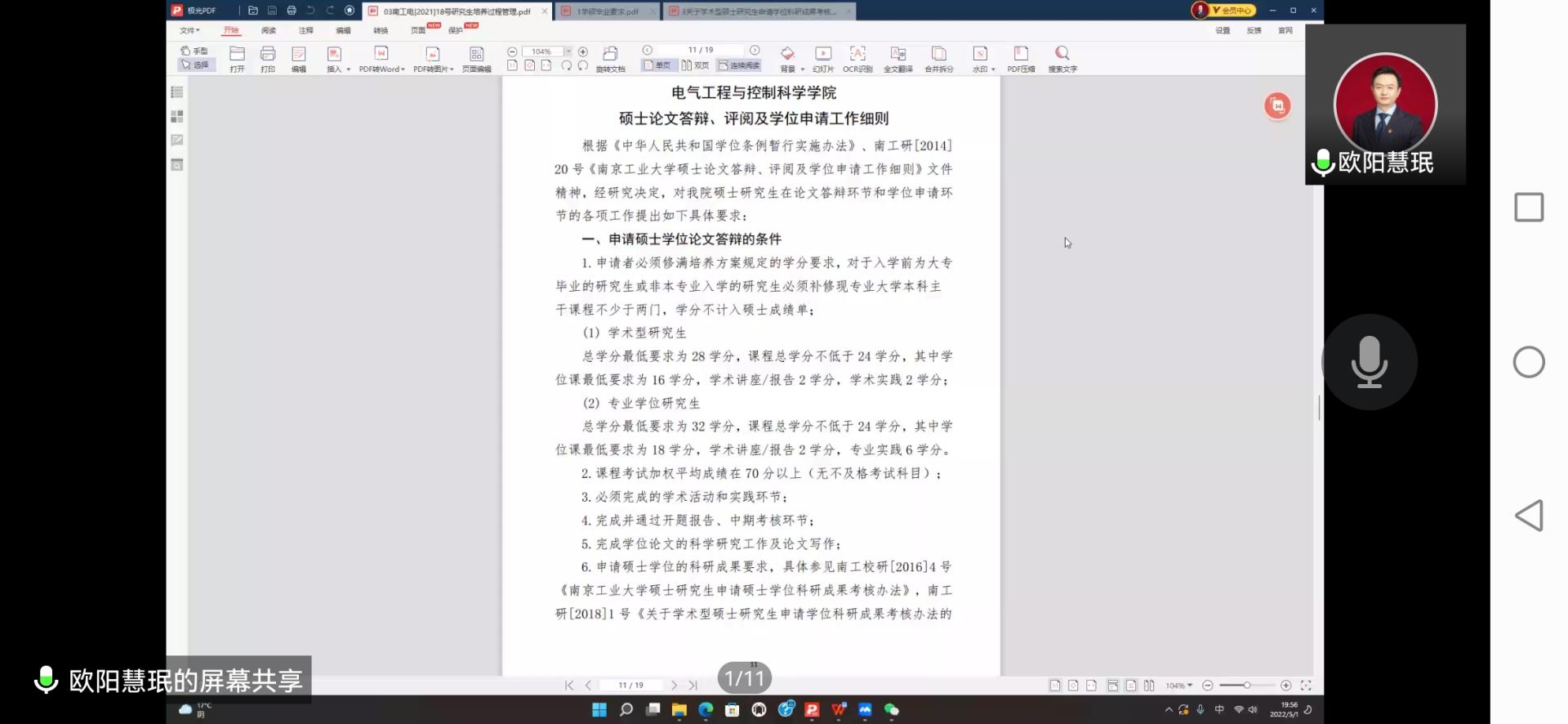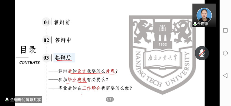 为缓解毕业生在疫情下毕业前的紧张焦虑情绪,帮助他们提前了解答辩流程、顺利完成毕业相关任务,5月1日公司举办线上专题辅导讲座,邀请公司副经理欧阳慧珉、青年教师金珊珊老师分别做了毕业答辩、学位申请专题辅导。公司2022届全体硕士毕业生参加讲座,讲座由辅导员王巧云老师主持。
