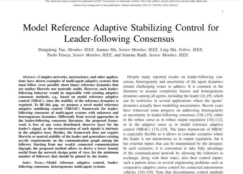 近日,公司动态系统协同控制、诊断与智能运维团队完成的论文“Model Reference Adaptive Stabilizing Control for Leader-following Consensus”被控制领域国际顶级期刊IEEE Transactions on Automatic Control录用并在线发表。团队岳冬冬副教授为第一作者,史建涛教授为通讯作者,香港科技大学Ling Shi教授、法国格勒诺布尔阿尔卑斯大学Paolo Frasca教授、东南大学Simone Baldi教授为论文合作者。