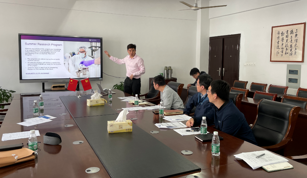 4月12上午,澳大利亚昆士兰大学Shaun Chen博士应邀来访公司交流电气工程与自动化专业“2+2本科联合培养”项目相关事宜,公司副经理欧阳慧珉教授,刘峰教授,王森副教授与赵亚军副教授,以及海外教育公司负责中外合作办学项目的董飞老师在412会议室开展座谈。