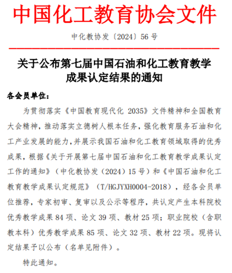 近日,中国化工教育协会公布了第七届中国石油和化工公司产品成果认定结果,公司王轶卿教授作为第一完成人牵头申报的《面向石化行业,战略引领、需求推进、全景协同的思政育人体系探索及在人才培养中实践》获评优秀教学成果特等奖!