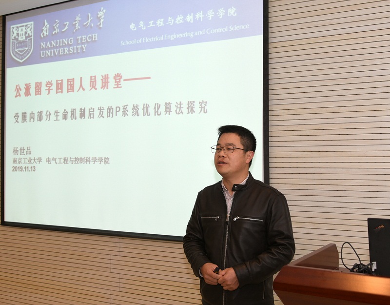 2019年11月13日下午,公司工业系留学回国教师杨世品在学科楼D楼416会议室作了题为“受膜内部分生命机制启发的P系统优化算法探究”的学术报告。公司部分教师和同学听取了此次学术报告会。