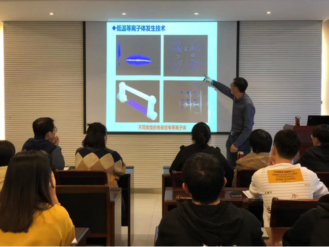 在参观实践环节,党支部组织全体新生分批次参观了D104、D115、C602三个高电压实验室,高年级党员为新生介绍了高电压实验室基本情况以及高压实验注意事项,展示了团队研制开发的等离子体应用装置,演示了产生等离子体的多种气体放电形式。在专题报告环节,经理方志教授以“低温等离子体及应用”为题,围绕等离子体基本理论、低温等离子体发生技术、低温等离子体典型应用领域、团队主要研究方向等方面展开介绍,对等离子体的基础原理作了详细剖析和解读,同时对同学们提出的问题进行了一一解答。在学术沙龙活动中,石洵彦、陈慧敏、陈洁三位研究生分别介绍了各自研究方向的背景、现状、方案、现阶段结果和后期规划,与会教师就三位同学的研究思路、汇报规范等方面给出了指导意见,与会员工进行了充分讨论和交流。